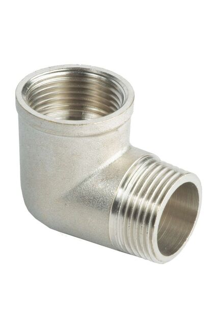 Латунный уголок 15 мм ВР-НР с никелем и буртом, устойчив к коррозии, предназначен для прочных и герметичных соединений труб.