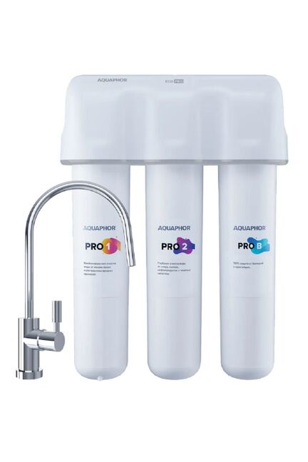 Cистема для глубокой очистки воды от химических примесей, бактерий, ржавчины и других растворенных и механических загрязнений. Многоступенчатая фильтрация ECO Pro включает инновационный модуль предочистки 2 в 1 с увеличенным ресурсом, сорбционные карбонблоки во всех трех картриджах и ультрафильтрационную половолоконную мембрану. Система оснащена новым коллектором с дополнительным уровнем безопасности. Абсолютная антибактериальная защита обеспечивается без применения химических бактерицидов. На стадии ультрафильтрации половолоконная мембрана удаляет бактерии и цисты микроорганизмов, некоторые из которых устойчивы к хлору и кипячению. Модель ECO Pro cохраняет исходный минеральный состав воды. Трёхступенчатая система фильтрации, до 8000 л ресурса, удаляет бактерии и примеси, быстрый монтаж и лёгкая замена картриджей.